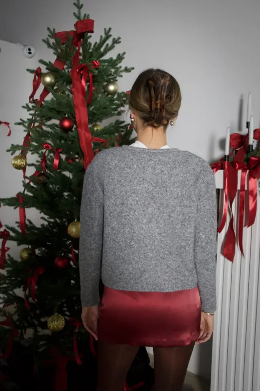 The Annalise Heather Cardigan is a soft, elevated basic crafted in a wool-mix knit with a cozy brushed texture. Designed in a heather grey tone, it features delicate, shiny monochromatic buttons down the front for a classic, refined finish. Lightweight yet warm, this mid-length cardigan layers effortlessly over festive skirts, denim, or dresses—perfect for holiday gatherings, winter days, and everything in between.
