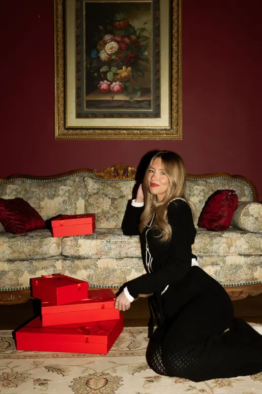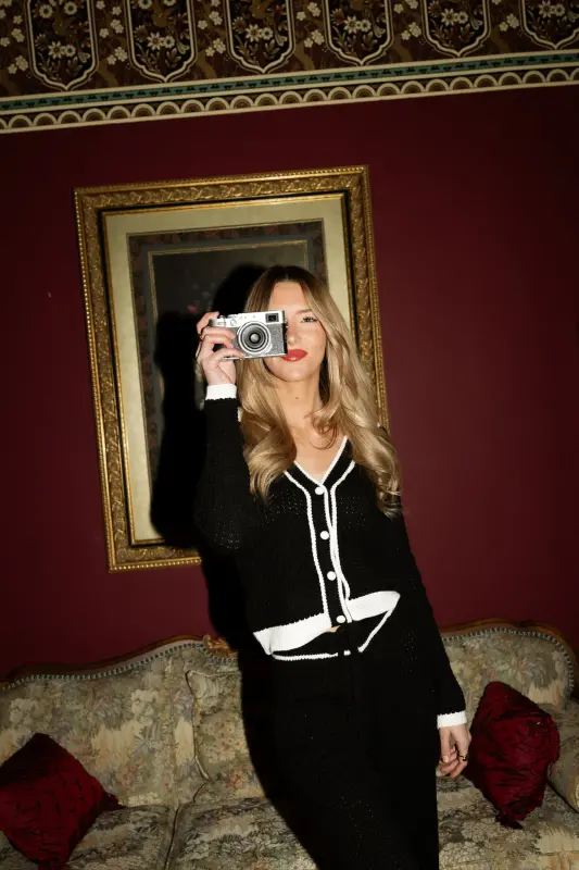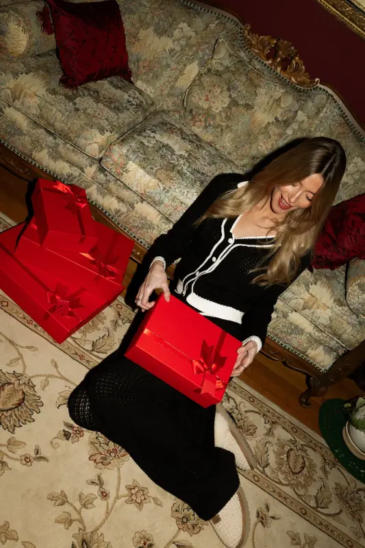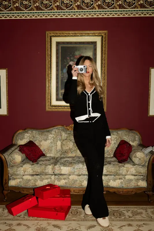Two-tone knit cardigan in black and cream. Features classic collar, four-button closure, and long sleeves.