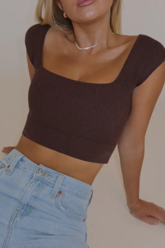 Our Espresso Knit Shortsleeve is a form-fitted knit top that features a square neckline, cap sleeves, and cropped fit. This top is made of a soft wool ribbed material that gives the top a quality look and comfortable fit. Pair this top with any bottom for a cute look!