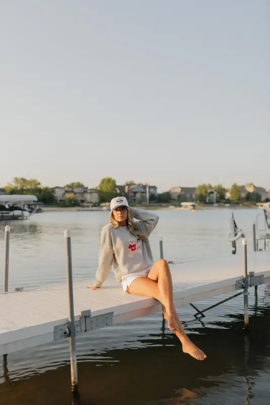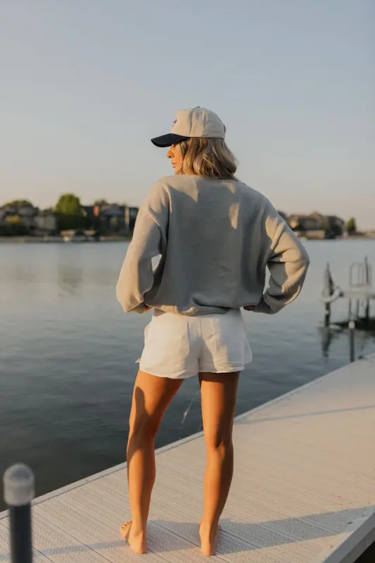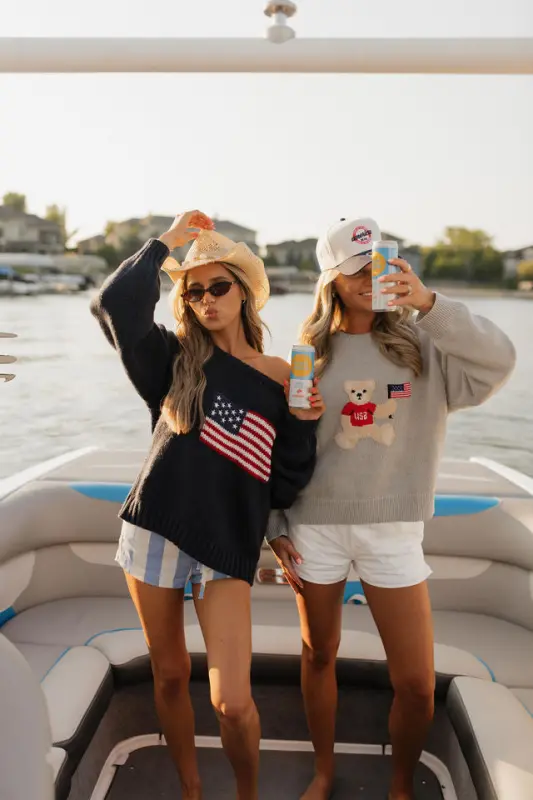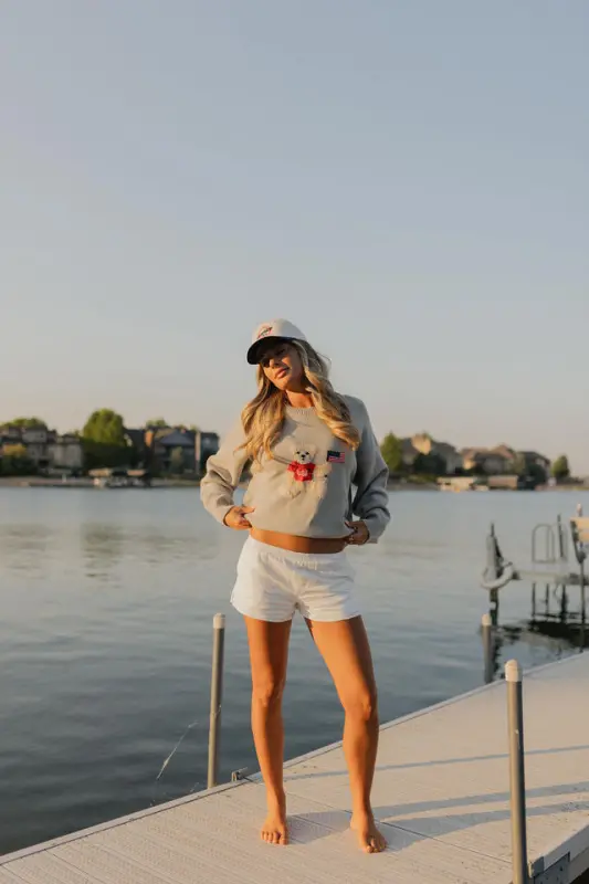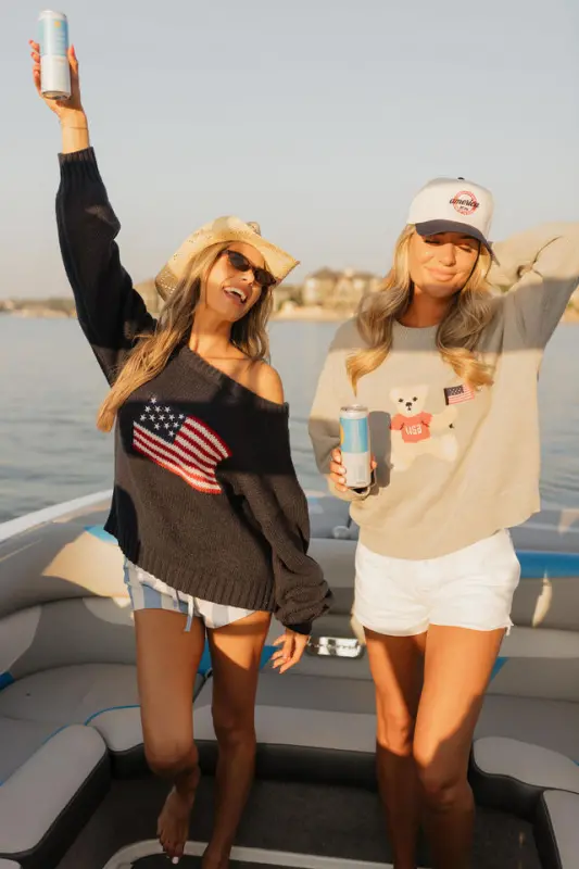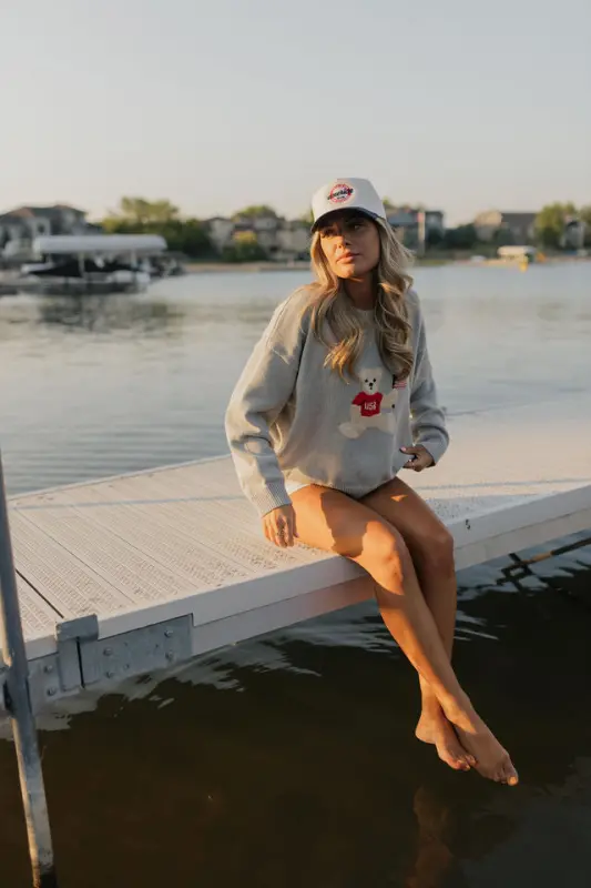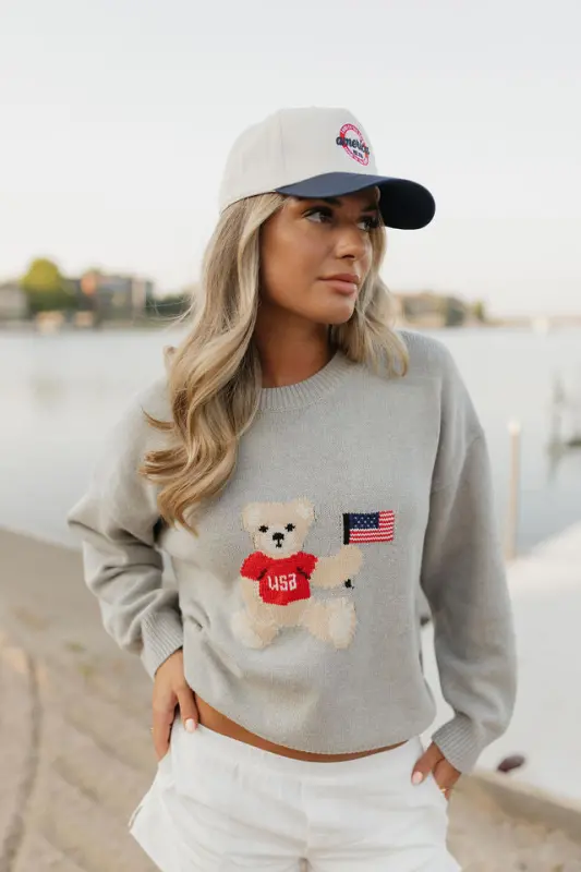 The Grey America Teddy Bear Sweater is a cozy, playful staple made for laid-back summer nights and lakeside adventures. This oversized knit sweater features a soft grey base with a charming knit USA teddy bear graphic front and center. Designed with a relaxed fit, drop shoulders, and a classic round neckline, it delivers ultimate comfort with effortless style. Perfect for boat nights, bonfires, or Fourth of July festivities, this sweater brings a nostalgic, Americana vibe to your summer wardrobe.