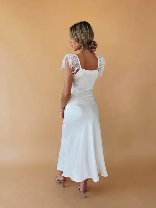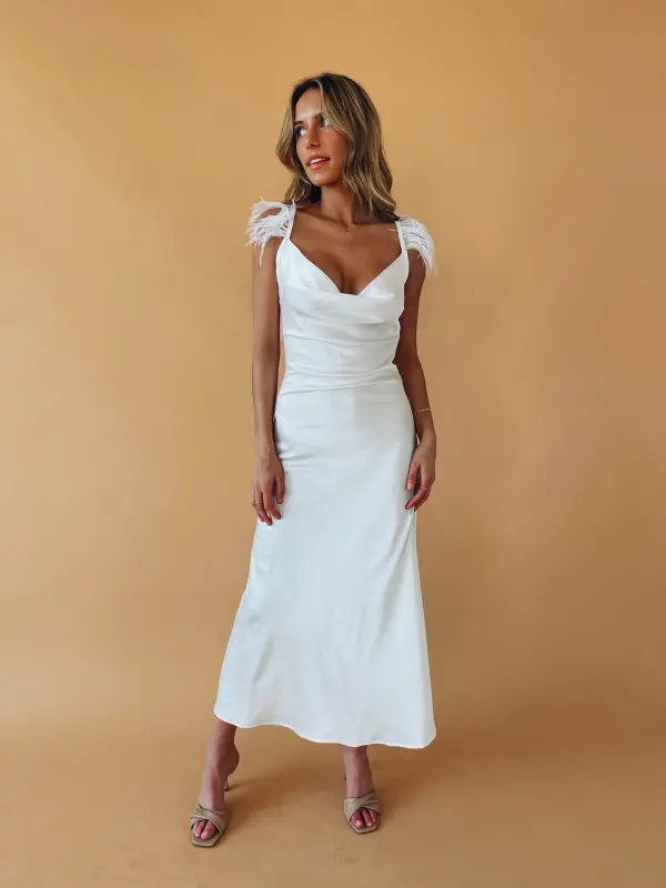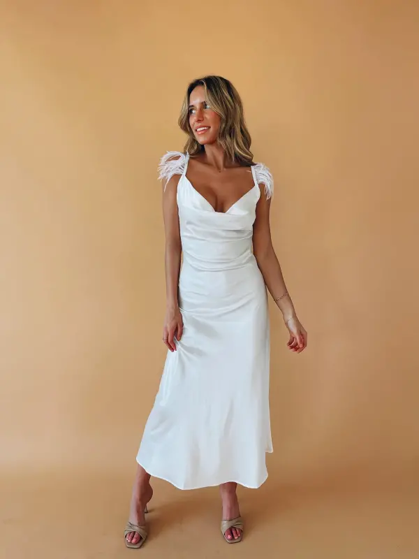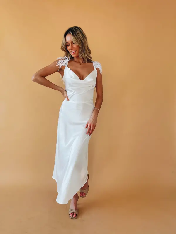 Our Natalia Feather Detail Maxi Dress is white satin maxi dress with a cowlneckline and fitted ruched waistline. The straps of this dress feature feather detail. This full length dress has all the drama you need for your upcoming event.