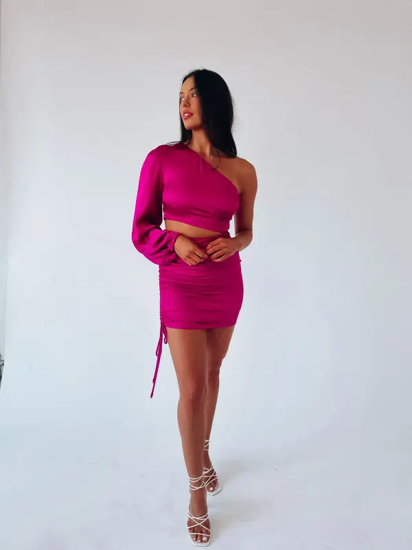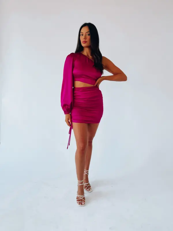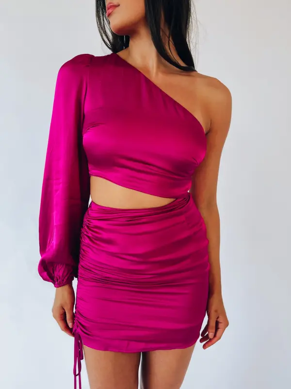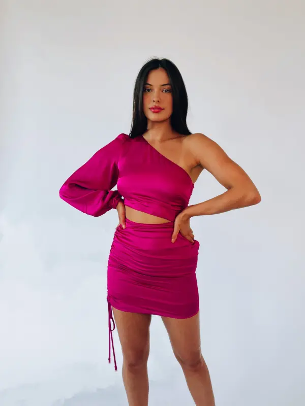Our Penelope Fuchsia One Sleeve Mini Dress has a one sleeve detail. There is a cut out detail on the side and the skirt has a synched side with a self tie to make it tighter or loosen it up. This mini dress has a hidden side seam zipper with a hook and eye clasp. The inside of this dress is LINED!