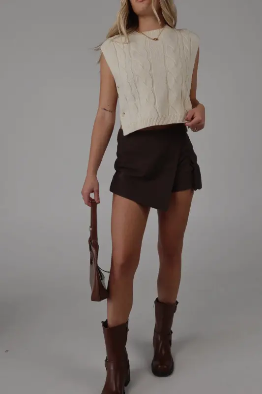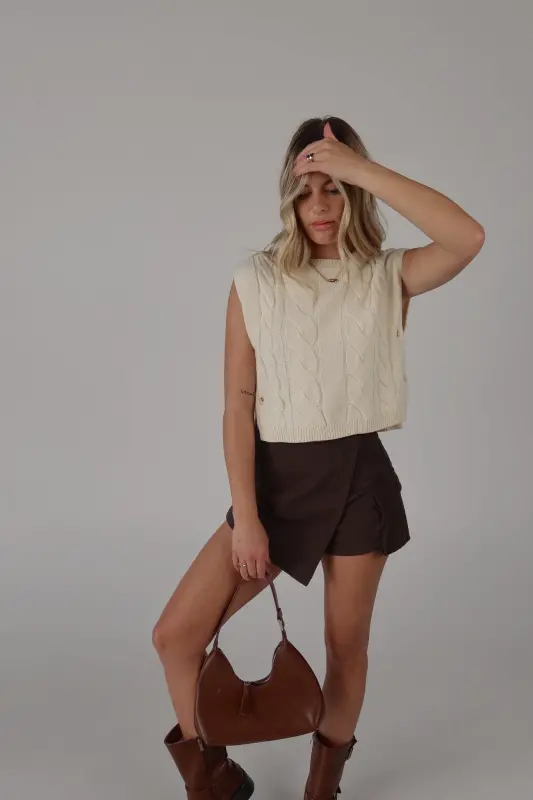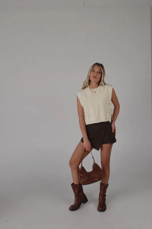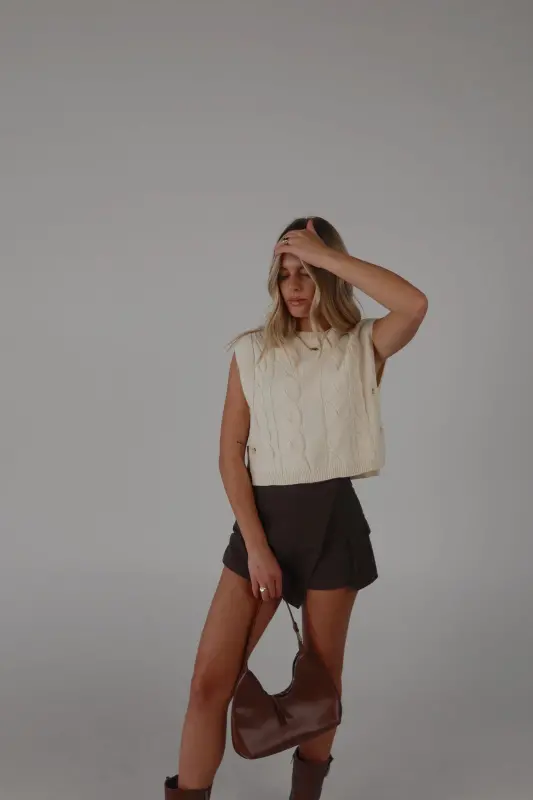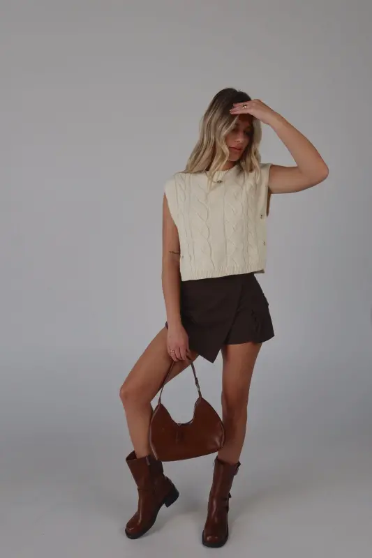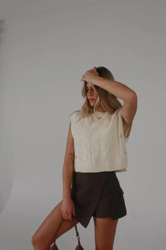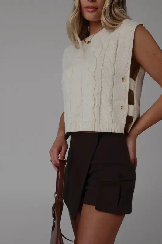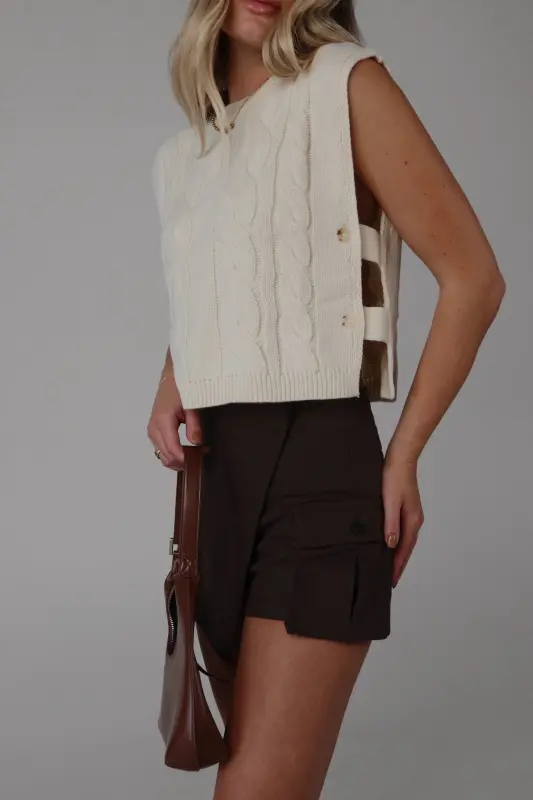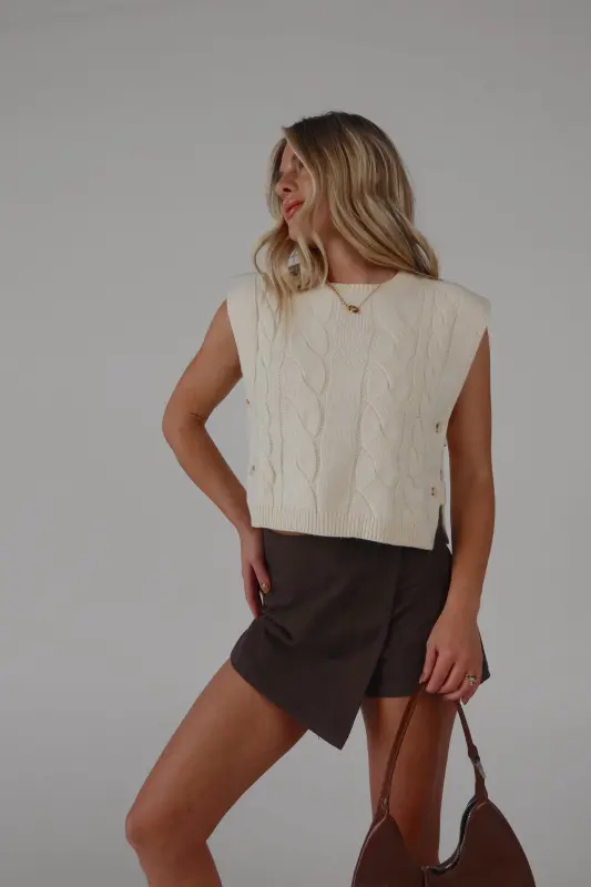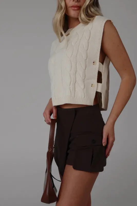 This sleeveless cable knit sweater vest features a unique open side design and button closure detail. Made with high-quality materials, this versatile vest adds a touch of style to any outfit. Perfect for layering and staying warm in colder weather.